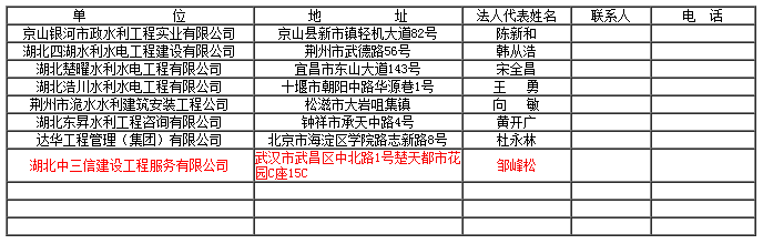 根據(jù)荊水[2008]195號文件《關(guān)于開展荊門市水利水電工程參建企業(yè)資質(zhì)信譽(yù)登記的通知》精神,第二批來荊進(jìn)行資質(zhì)信譽(yù)登記的企業(yè)已經(jīng)審查,擬準(zhǔn)予登記。特此公告。(附企業(yè)名單)