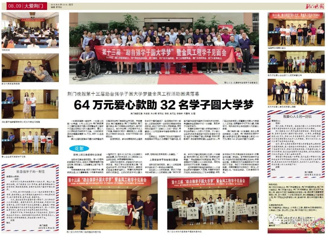 《荊門(mén)晚報(bào)》是一份有溫暖、有社會(huì)責(zé)任的報(bào)紙,13年來(lái),荊門(mén)晚報(bào)助自強(qiáng)學(xué)子圓大學(xué)夢(mèng)活動(dòng)已累計(jì)籌集愛(ài)心款近600萬(wàn)元,幫助540多名學(xué)子圓了大學(xué)夢(mèng)。