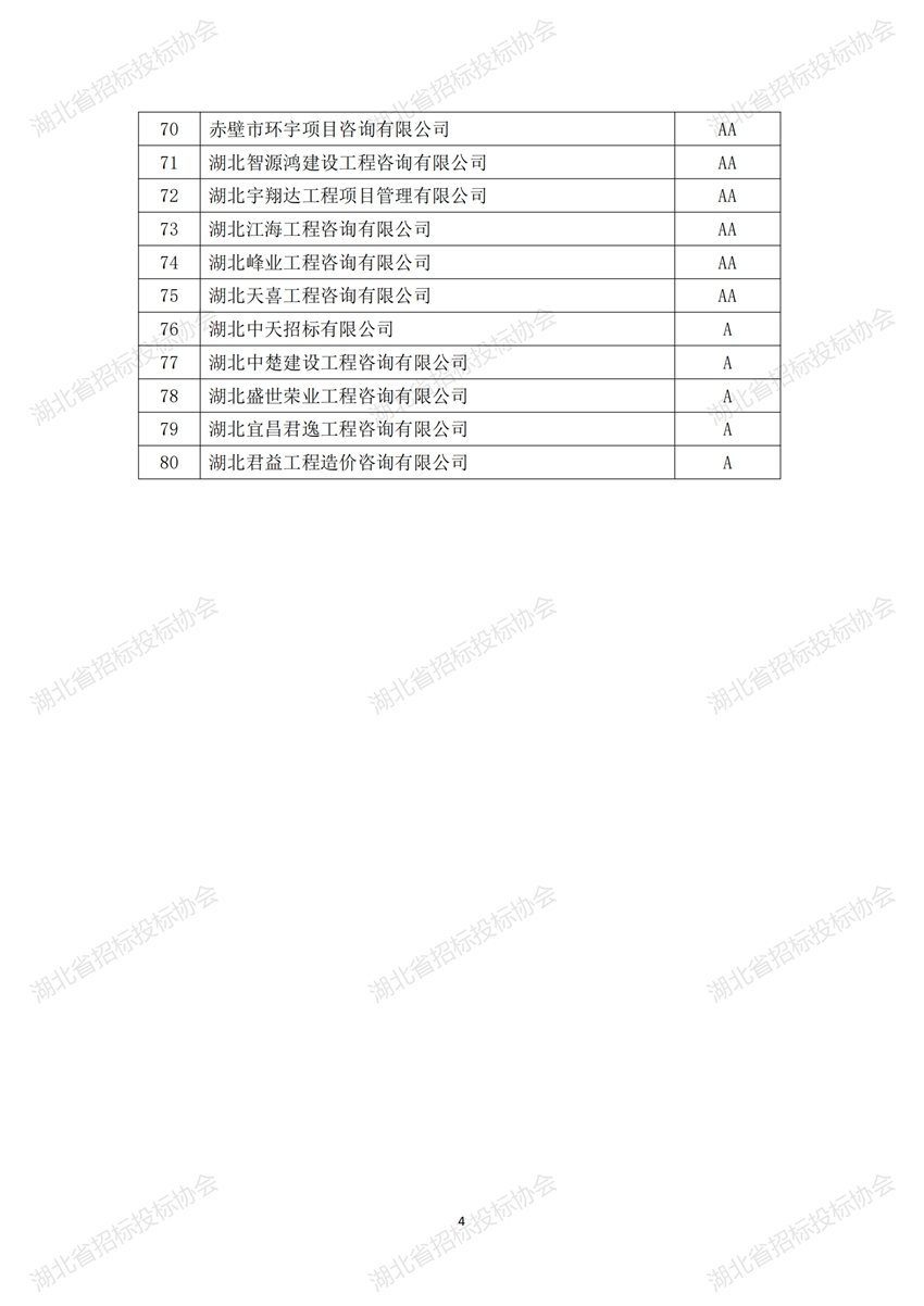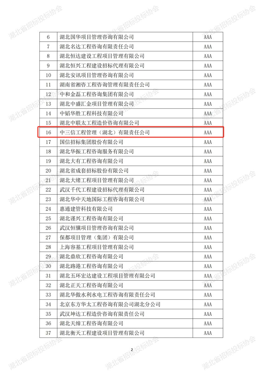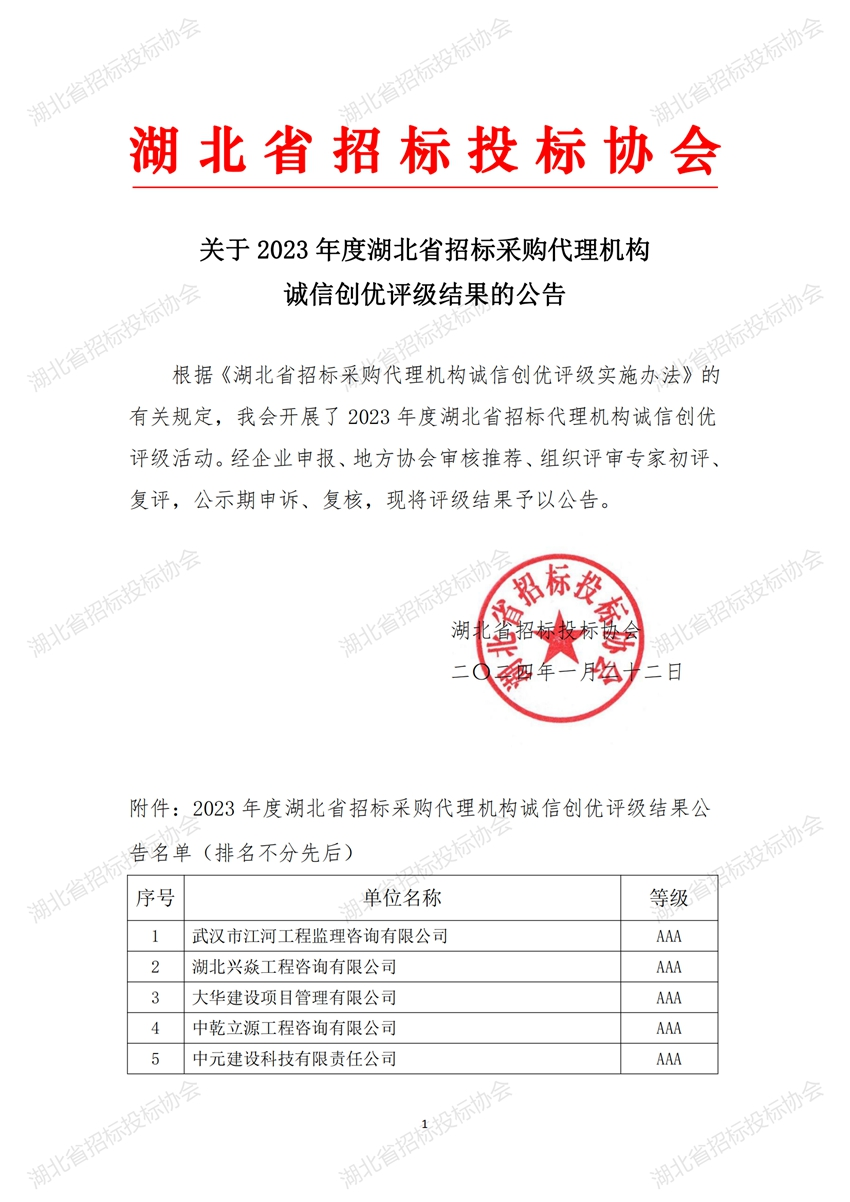 根據(jù)《湖北省招標(biāo)采購代理機(jī)構(gòu)誠信創(chuàng)優(yōu)評級實(shí)施辦法》的有關(guān)規(guī)定,我會開展了2023年度湖北省招標(biāo)代理機(jī)構(gòu)誠信創(chuàng)優(yōu)評級活動。經(jīng)企業(yè)申報、地方協(xié)會審核推薦、組織評審專家初評、復(fù)評,公示期申訴、復(fù)核,現(xiàn)將評級結(jié)果予以公告。
